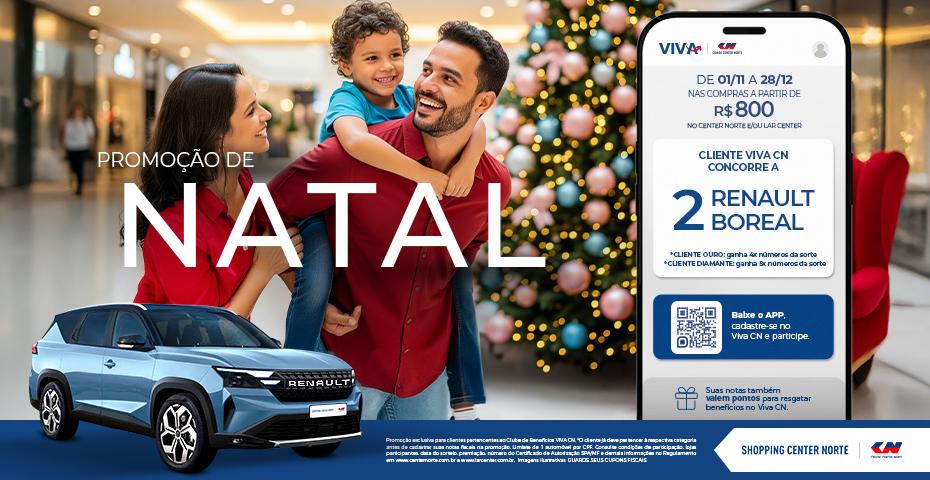A época mais encantadora do ano chegou, e com ela vem uma oportunidade imperdível! Os shoppings Center Norte e Lar Center dão início à Promoção de Natal, que vai sortear dois carros Renault Boreal, modelo inédito e ainda em pré-venda no Brasil.
